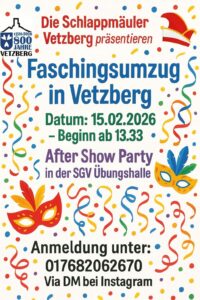 Am Sonntag, den 15.2. im Anschluss an den großen Biebertaler Fastnachtsumzug durch Vetzberg startet das große SGV-Faschingstreiben für Jung und Alt in der Übungshalle am Sportplatz.